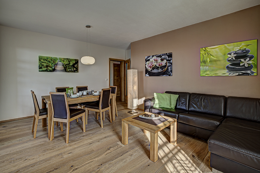 Der geräumige Koch-, Ess- und Wohnbereich ist durch die großen Fenster sowie die Balkontüren sonnendurchflutet und sehr freundlich. Die komfortable Ledergarnitur kann bei Bedarf zu einem Doppelbett ausgezogen werden.